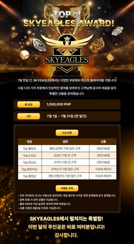 SKYEAGLES에서는 7월 한 달간 활약이 돋보인 회원 여러분을 선정하여, 특별한 선물과 함께 그 노고에 감사의 마음을 전합니다. 다섯 가지 주요 부문에서 가장 인상적인 기록을 보여준 회원들에게 풍성한 혜택이 기다리고 있습니다.